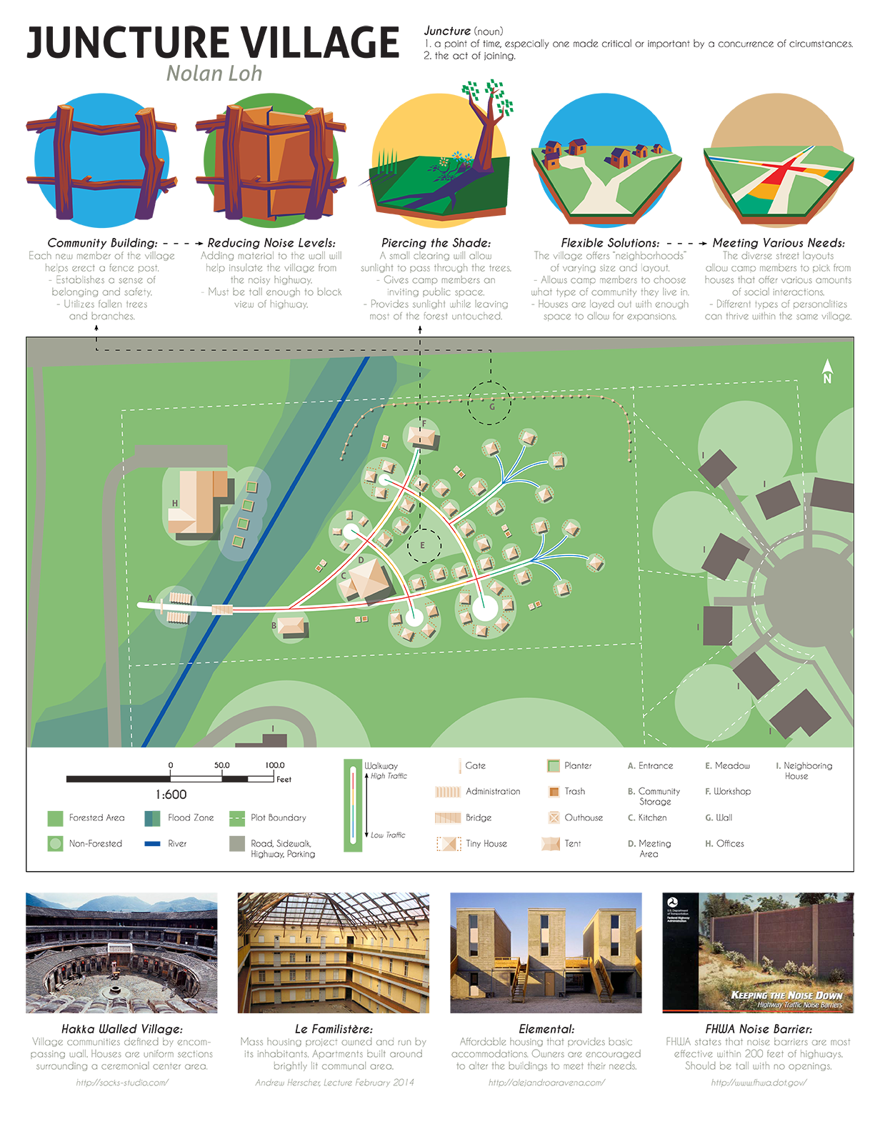 I worked with a local group of homeless people called Camp Take Notice as part as an engagement studio. Camp Take Notice emphasises community and taking responsibility for your own life. This approach leads to many people turning their lives around. Recently, they purchased a plot of land and have been working with the city of Ann Arbor toward becoming a tiny house city. My site plan, Juncture Village, is structured around community dynamics and community building projects. The layout accommodates the range of personalities and problems that camp members have.